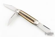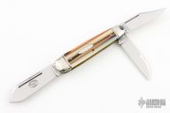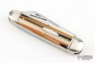 This 3-blade by Great Eastern Cutlery features three polish finished blades with long pulls, nail nicks and false top edges. The handle has pinched and fluted nickel silver bolsters, acrylic covers with nickel silver escutcheon, brass liners/pins, and stainless steel springs. Comes with original tube and wax paper. Has some light scratches, otherwise excellent condition.
