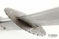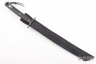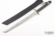 This Wakizashi by Jim Ort features a Damascus blade with .176" blade stock and 1.30"4 blade depth, full tang construction. The handle has a fileworked Damascus guard, black canvas micarta scales with nickel silver pins. Comes with a black leather sheath. Has some scratches and patina, otherwise good condition.