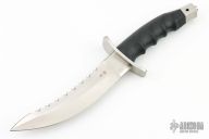 This Warrior from Al Mar Knives features a satin finished blade with serrated top edge, .233" blade stock and 1.476" blade depth, hidden tang construction. The handle has a stainless steel double guard, black rubberized handle, and a stainless steel butt. Comes with original box. Excellent condition.