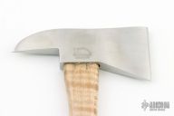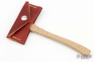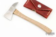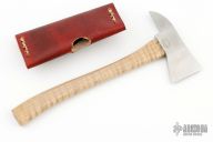 This Miniature Fire Axe by Lee McDowell features a satin finished head with a 1.25" blade and 2.75" from blade to spike tip, curly maple haft. Excellent condition. Comes with a brown leather sheath.