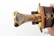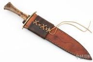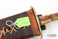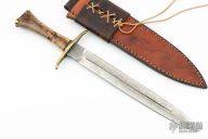 This "Old Bones" Dagger by Gary Griffin features a double edged blade with fullers made from a file, has a forced patina finish, .233" blade stock and 1.305" blade depth, hidden tang construction. The handle has a brass guard and butt plate with "old bones" grip, leather and brass spacers, brass pins, brass butt plate. Comes with a brown leather sheath. Excellent condition, it looks like it was intended to look when it was made.