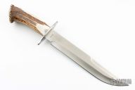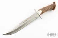 This Alamo Bowie by Katz is a limited edition of 300. It features a satin finished blade with false top edge, .241" blade stock and 1.450" blade depth, hidden tang construction. The handle has a stainless steel guard with crown stag grip. Comes with a wooden display box. Excellent condition.