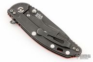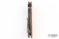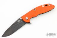 This Skinny XM-18 3.5" flipper by Rick Hinderer features a battle black blade with notched thumbrest and flipper. The handle has a battle black titanium frame with an orange G-10 scale, a tip up or down reversible titanium clip and filler tab, lanyard hole at the butt. Has some scuffs, has been resharpened, otherwise good condition. Comes with original box and extra hardware.