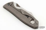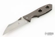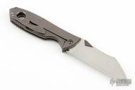 This Wench frame lock by Jeremy Marsh features a hand rub satin finished wharncliffe blade with dual titanium thumb lugs. The handle has a dark stonewash finished titanium frame with with matching tip up clip. Nice detent, lockup and blade seating. Excellent condition. Dated 5/2012