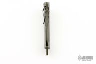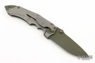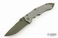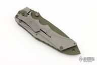This VDT folder by Jim Burke features a green coated spear point blade with single skull thumbstud and notched thumbrest. The handle has a tumble finished titanium frame and tip down clip with a green coated stainless steel backspacer and pivot collar. Nice detent, lockup, and blade seating. Has some scuffs on blade from use, no marks on the knife otherwise, otherwise good condition.