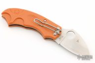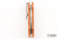 Set inside the handle is a Phantom Lock that has no visible unlocking mechanism. To unlock: Settle your thumb on the divot located on the end of the folder (over the bug). Push forward, moving the handle scale downward/forward a couple millimeters releasing the blade, easily done with one-hand. Along the underside of the handle a succession of angles form placement points for the hand and channel ergonomic grip into control over the cutting edge. Steel liners inside the FRN boost the lock's strength and a double as a plate for securing screws attaching the tip-down tension-wire clip. Shaped in a modified leaf pattern, the blade is hollow-ground laminated steel with a spine cusp for thumb traction.