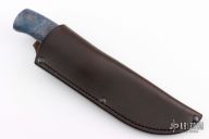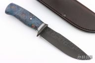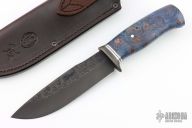 This Hunter by James Behring features a black cerekote finished and hammer marked blade with .192" blade stock and 1.425" blade depth, hidden tang construction. The handle has a coated steel guard, burl grip with stainless/black/green spacers and a stainless pin. Comes with a brown leather sheath and zipper case. Excellent condition.
