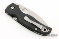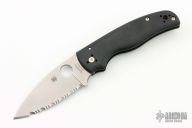 This Shaman PLN by Spyderco features a stonewashed spear point fully serrated blade with notched thumb and finger rests, thumbhole. The handle has black G-10 scales, inlaid stainless steel liners and a stonewashed stainless steel backspacer, 4-way reversible stainless steel clip, lanyard hole at the butt. Comes with original box and papers. New condition.