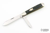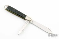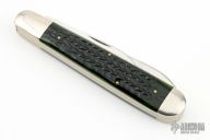 This slipjoint from Northwoods Knives features polished blades with swedges and nail nicks. The handle has nickel silver bolsters with jigged bone covers and over brass liners and stainless steel spring. Has half-stops. Has a few light scratches, otherwise excellent condition. Comes with a black leather sheath.