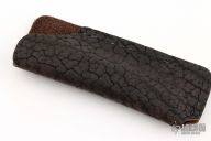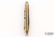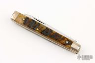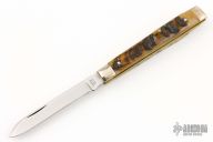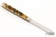 This slipjoint by Northwoods Knives features a polished  blade with swedge and nail nick. The handle has nickel silver bolsters, sheeps horn covers, brass liners and stainless steel spring. Has half-stop. Includes leather slip sheath. Excellent condition.