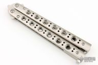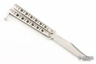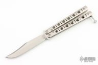 This Model 63 Balisong by Benchmade features a clip point blade with swedge. The handle has a skeletonized stainless steel construction over steel spacers, t-latch. Comes with original box, papers and sheath. Excellent condition.
