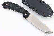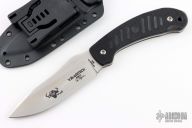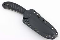This N'yati by Bladetech is a Jim Wagner design. It features a satin finished recurve blade with notched thumbrest, 0.155" blade stock and 1.35" blade depth, full tang construction with textured black G-10 scales. Comes with custom kydex sheath with TekLok. Has a few light scratches, otherwise great condition.