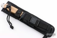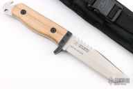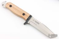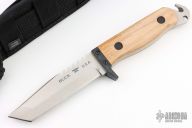 This CM Adaptor was designed by country music star Craig Morgan and produced by Buck. It features a satin finished drop point tanto style blade with swedge and saw teeth along the spine. 0.181" blade stock and 1.130" blade depth. The handle is comprised of a black G10 guard and oak scales over full tang construction. Exposed tang pommel with strap cutter and lanyard hole. Includes M.O.L.L.E. compatible nylon sheath. Excellent condition. Marked 190/200 on blade.