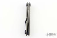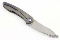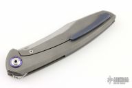 This Russkiy from Alexander Cheburkov features a matte finished blade with swedge, notched thumb rest and flipper. The handle has a tumbled titanium frame with an anodized titanium backspacer, pivot collars and tip up clip with hidden screws. Includes original box and papers. Rides on bearings, nice detent, lockup and blade seating. Has stainless lock insert. Lanyard pin at the butt. Has a couple light scuffs, otherwise excellent condition. Dated 2019