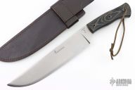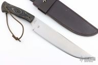 This Crowell/Barker Competition Knife by Browning features a satin finished blade, .229" blade stock and 1.839" blade depth, full tapered tang construction with black linen micarta scales. Comes with original black leather sheath. Has some light scuffs, otherwise excellent condition.