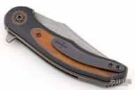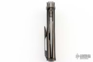 This Model #33 linerlock flipper by Brad Richmond features a stonewashed blade with notched thumbrest and flipper. The handle has black G-10 scales with lignum vitae inlays framed in carbon fiber, lignum vitae pivot collars framed in carbon fiber, tumbled titanium liners, blackened titanium backspacer and tip up clip. Rides on stainless bearings with ceramic detent. Nice detent, lockup and blade seating. Comes with a zippered case and COA dated May 2021. Excellent condition.