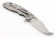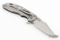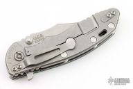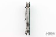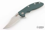 This XM-18 Flipper by Rick Hinderer Knives features a 3.5" stonewash finish blade, notched thumbrest and flipper, dual thumbstuds. The handle has a forest green G-10 scale, and stonewashed titanium handle and satin finished hardware, filler tab, and titanium clip. Clip can be mounted for tip up or down carry. Nice lockup, seating, and detent. Excellent condition.