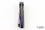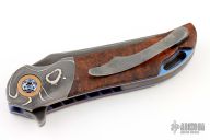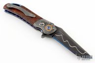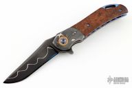 This knife by Cory Martin features a San Mai Damascus blade with flipper. The handle has matching Damascus bolsters, cherry wood scales, Damascus tip up clip, anodized titanium liners with jeweled interiors, matching Damascus backspacer with copper liners. Nice detent, lockup and blade seating. Excellent condition. Comes with a zippered case.