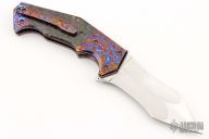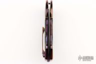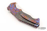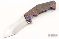 This Serpent Flipper by Randy Doucette feautes a satin finished spear point blade with false top edge and flipper tab. The handle has copper dust shard carbon fiber scales, MokuTi bolsters, anodized titanium liners with jeweled interiors, anodized titanium backspacer, MokuTi tip up clip. Nice action, detent, and blade seating. Comes with padded zipper case. Has a couple light scuffs, otherwise excellent condition.