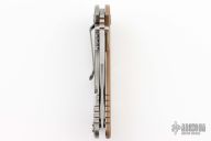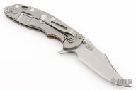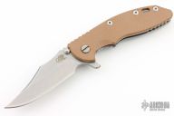 This XM-18 Flipper by Rick Hinderer Knives features a 3.5" stonewash finish blade, notched thumbrest and flipper, dual thumbstuds. The handle has a tan G-10 scale, and stonewashed titanium handle and satin finished hardware, filler tab, and titanium clip. Clip can be mounted for tip up or down carry. Nice lockup, seating, and detent. Includes additional green G10 scale. Has been resharpened, excellent condition otherwise.