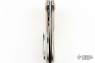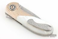 This Tenor by DKB Knives features a Damascus blade with false top edge and a flipper. The handle has mokume bolsters with Damascus pivot collars and a custom pivot, mother of pearl scales with hidden screws, orange peel finished titanium liners, Damascus backspacer and tip up clip with hidden screws. There is no visible hardware except for the pivot. Rides on bearings, nice detent, lockup and blade seating.  Comes with a zippered case. Excellent condition.