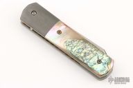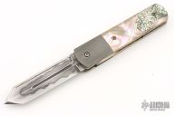 This Small Dagger Linerlock by Chuck Gedraitis features a tanto dagger blade with false top edge, nail nick and nice hamon. The he handle has Zirconium bolsters, abalone scales, anodized titanium liners and a carbon fiber backspacer. Nice detent and lockup. Has a couple light scuffs, otherwise excellent condition. Comes with leather slip sheath.
