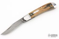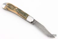 This slipjoint by Bobby Toole features an antique finished blade with nail nick. The handle has fluted stainless steel bolsters, mammoth ivory covers with stainless steel escutcheon, stainless steel liners and darkened steel spring. Has half stop, flush in all positions. Has some light scratches, otherwise excellent condition. Comes with a zippered case.