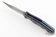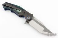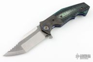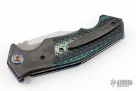 This Outlaw flipper by Randy Doucette features a satin finish, bowie style blade with notched thumbrest and flipper. The handle has carbon fiber bolsters, multi-color twill scales, anodized titanium liners with jeweled interiors, floating zirconium backspacer, carbon fiber tip up pocket clip. Nice blade seating and lock up, crisp and fast flipping action on bearings. Comes with a zippered case. Excellent condition.