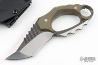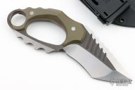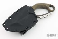 This Karambit by RSK features a two-tone blade with .376" blade stock and 2.251" blade depth, full tang construction. The handle has green G-10 scales. Comes with a kydex sheath. Excellent condition.