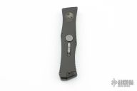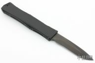This Combat Talon II by Microtech features a black blade with false top edge. Push button automatic opening. Closes via a reverse charging handle in the rear of the frame. Contoured aluminum frame with milled ribbing on the frame spine and belly. Dated 04/2001. Comes with original box, sheath and papers. Excellent condition.