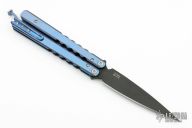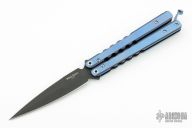 This Flyfather from Pro-Tech features a black blade with false top edge. The handles are orange peel finished and anodized titanium with matching tip up clip and T-latch. #25 of 30. Excellent condition. Comes with original box and papers.