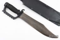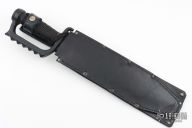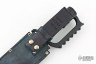 This fighter by EDMF (Eight Dollar Mountain Foundry) features a blued blade with .154" blade stock and 2.396" blade depth, hidden tang construction. The handle is cast, coated black handle with cord wrap. Comes with a black leather sheath. Has some light scuffs/scratches, but otherwise excellent condition. This knife is dated 11/08.