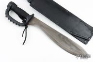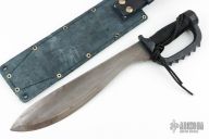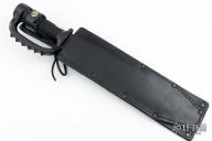 This fighter by EDMF (Eight Dollar Mountain Foundry) features a blued blade with sharpened top edge, .150" blade stock and 2.199" blade depth, hidden tang construction. The handle is cast, coated black handle with cord wrap. Comes with a black leather sheath. Has some light scuffs/scratches, but otherwise excellent condition. This knife is dated 11/08.