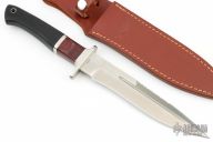 This Large Fighter by Junglee Knives features a satin finished recurve blade with sharpened top edge and partial serrations, .199" blade stock and 1.336" blade depth, hidden tang construction. The handle has a nickel silver guard with checkered rubber grip, nickel silver and wood spacers. Comes with a brown leather sheath and zippered case. Has a few light scratches, otherwise excellent condition.