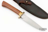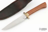 This Fighter by Journeyman Smith Jim Poling features a hand rub satin finished blade with .172" blade stock and 1.133" blade depth, hidden tang construction. The handle has a fluted brass guard with brass spacer, and wood grip. Comes with a brown leather sheath and zippered case. Has some light scratches and patina, otherwise great condition.
