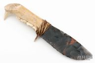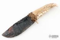 This knife features a flint knapped obsidian blade that has been attached to a jawbone with a sinew wrap. Includes a zipper case. Excellent condition.