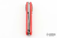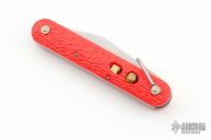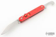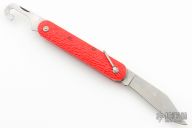 This knife by Camillus features a clip point blade. The handle has orange jigged scales, stainless steel liners and backspacer. Scratches are visible on the blade and handle otherwise the knife is in great condition. Has some blade play and some patina. Has Safety.