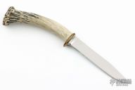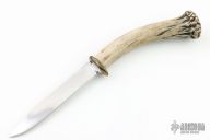 This knife by Z Custom Knives features a mirror polished clip point blade with .130" blade stock and .484" blade depth, hidden tang construction. The handle has a brass guard and a crown stag grip. Comes with a zipper case. Has scuffs, scratches, and patina. Great condition otherwise.