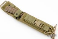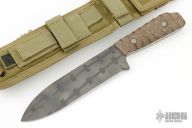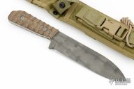 This knife by Duane Dwyer features a bead blasted blade with Concertina Razor Wire pattern on blade, .252" blade stock and 1.745" blade depth, full tang construction. The handle has natural canvas micarta scales. Comes with a nylon Eagle Industries sheath. Has a couple light scuffs, otherwise excellent condition.