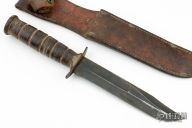 This USMC Fighter from Camillus Knives was from WWII.  This design has been standard military issue since WW2.  Has a black blade with sharpened top edge, .160" blade stock and 1.207" blade depth, hidden tang construction. The handle has a steel guard and butt with stacked leather handle. Comes with brown leather sheath. Has some scuffs on blade from use, otherwise good condition.