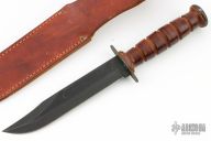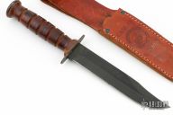 This USMC Fighter from Case Knives has a black blade with sharpened top edge and fullers, .170" blade stock and 1.252" blade depth, hidden tang construction. The handle has a steel guard and butt with stacked leather handle. Comes with original brown leather sheath. Has some scuffs, otherwise good condition.