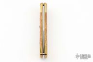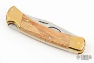 This Model custom 110 lockback folder by Buck Knives features a satin finished clip point blade with nail nick. The handle has brass bolsters,liners, oak scales, and stainless spring.  #0602/2003 signed Alfred C. Buck with hammer/knife silhouette. Comes with COA, box, and wood display box. Has some light scratches, and patina, excellent condition otherwise.