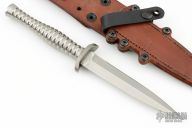 The Rook 6 Dagger project has been a long time in the works. We have managed to add several new spins on this traditional style dagger, that we feel set it apart from the rest of the field. The blade is 6 inches long, which accounts for the 6 in the Rook 6. The butt end of the knife reminded us of the rook piece in a chess set, bringing the whole thing together. The back of the guard has grip grooves machined into it, so when you put your thumb against it, it locks in. To get that, the guard is machined out of material over half an inch thick, not bent. The Chattanooga Leather works sheath is MOLLE compatible and brings the whole package together. Excellent condition.