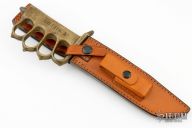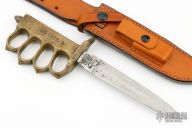 This is a Reproduction WWI trench knife is stamped "US 1918" on the blade, but it is very hard to see, the blade has been reground, but is in pretty rough shape. Cast Brass handle with U.S. 1918 stamped, it has has an "A" stamped on the handle. Comes with a brown leather sheath. Hard to say exactly who made this one, or what kind of reproduction it is. The casting of the handle is a little rough, otherwise, its still a cool trench knife.