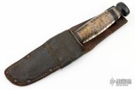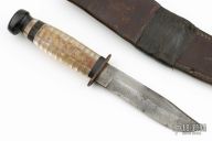 This USN Knife from Camillus Knives has a clip point blade with false top edge, .164" blade stock and .982" blade depth, hidden tang construction. The handle has a steel guard, stacked clear lexan/plastic grip and black butt. Comes with a brown leather sheath. Has some scratches and patina, dings, otherwise good condition for its age. Kind of a cool old piece that was rehandled at somepoint, I assume this is a theatre made item.