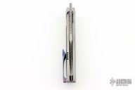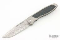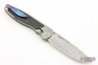 This Mini Tempest from Brian Nadeau features a Damasteel drop point blade with a fuller and notched thumbrest/front flipper. The handle has a bead blasted titanium frame with Blue Dark Matter FatCarbon inlays, IMSS Black Timascus tip up clip. Nice detent, lockup and blade seating, stainless lockface insert. Includes original box and original clip. Has a couple light scuffs, otherwise excellent condition.