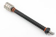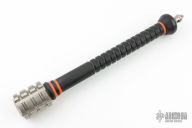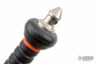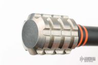 This Titanium Mace by Patrick Ober features a black linen micarta grip with orange G-10 spacers. The head is 2" in diameter stonewashed titanium and the butt is .700" in diameter with a lanyard hole. New from maker!