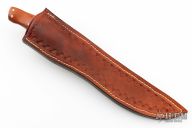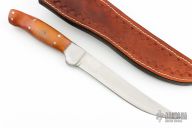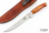 This Rigid Fillet Knife by Lowell Bray features a satin finish blade, .106" blade stock, .941" blade depth, full tang construction with contoured antique Bakelite scales, stainless and mosaic pins. Comes with a hand tooled brown leather sheath. New from maker.
