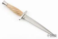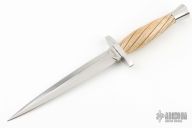 This dagger by Mike Mercer features a hand rub satin finished double edged blade with .230" blade stock and .938" blade depth, hidden tang construction. The handle has a stainless steel guard and butt with a spiral fluted oosic grip. Excellent condition.