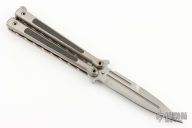 This Balisong from Darrel Ralph features a hand rub satin finished blade. The handle has titanium handles with carbon fiber inlays and a fileworked latch. Includes the original padded zipped case. Excellent Condition.